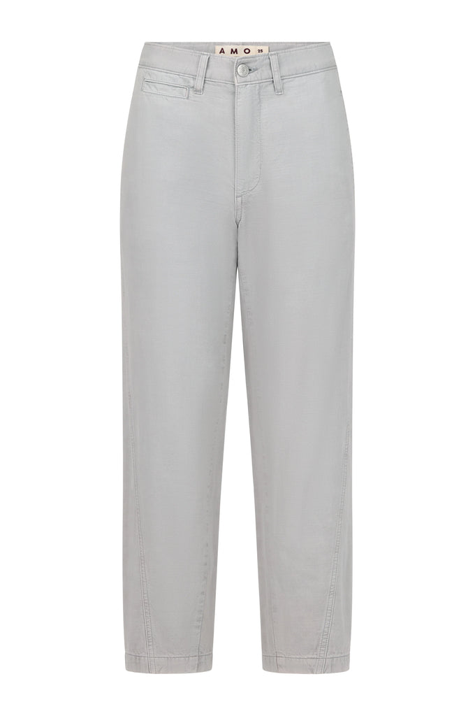Mid rise, loose fit trouser with a curved outseam, cropped leg, and let-down hem for a vintage-inspired feel.