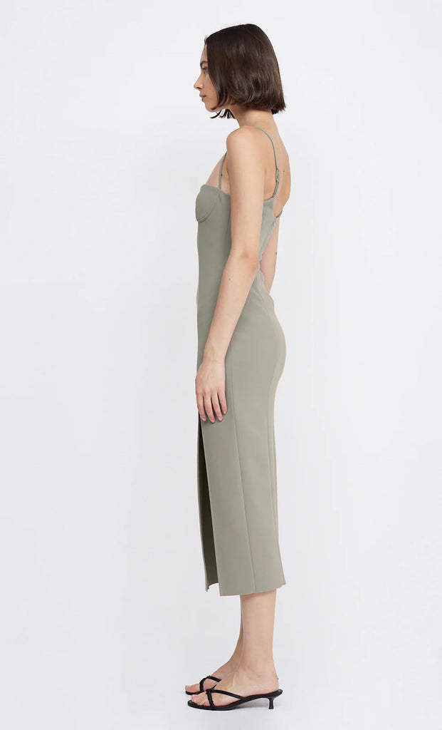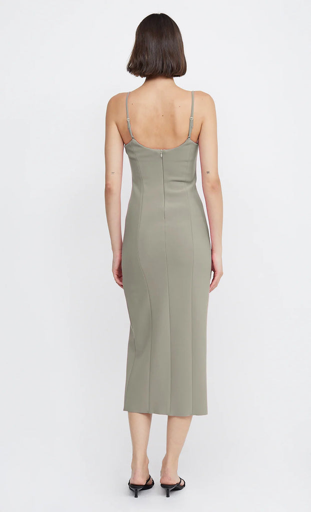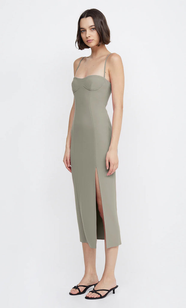 A figure hugging design with a slight sweetheart neckline, the Marisol Midi Dress is cut from our signature stretch bonded crepe. The midi dress features a bias bind at the under bust, bust darts, shape seams throughout the body of the dress and a high front split. This garment is certified Australian made.