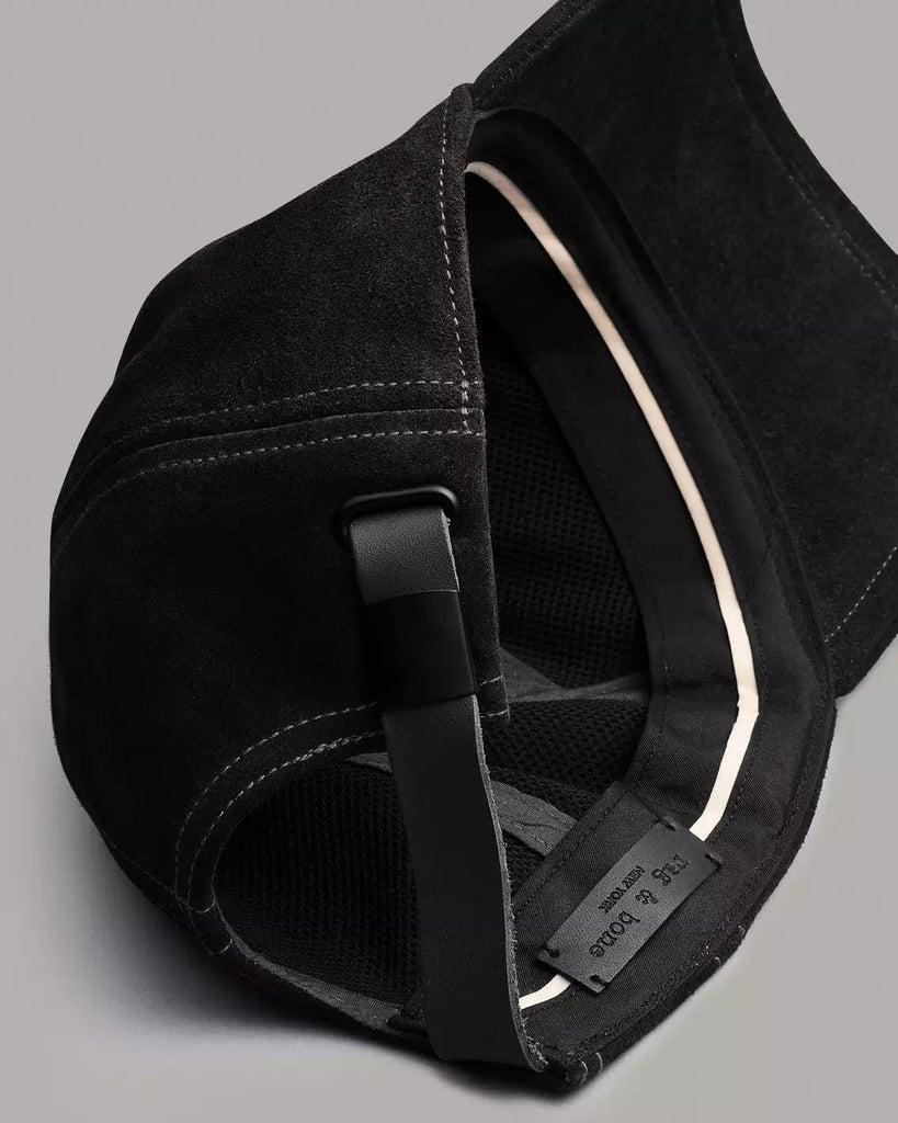Classic baseball cap crafted in nubuck leather with micro perforations at the back. Features an adjustable strap and custom hardware.