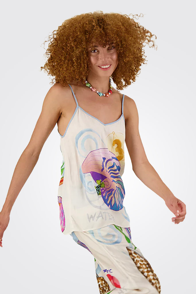 Ocean themed v-neck camisole. Front features a large shell graphic and reads “WATER”. Back has a large starfish graphic along with shells and plant life. Back says,”AIR”. Super cute with our matching pants or shorts.