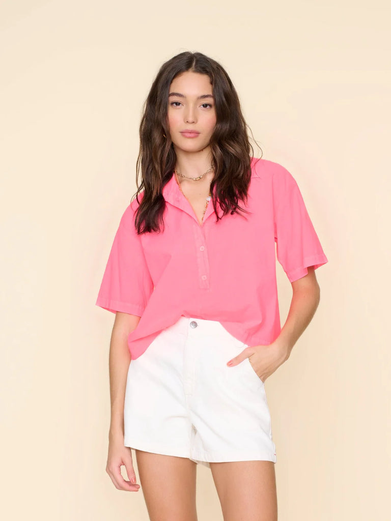 Play it cool. Ansel is new this season in our classic lightweight woven cotton poplin for a lived-in look and feel. This boxy top features a partial button-front, point collar, elbow sleeves, and box-pleated back yoke.