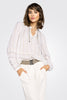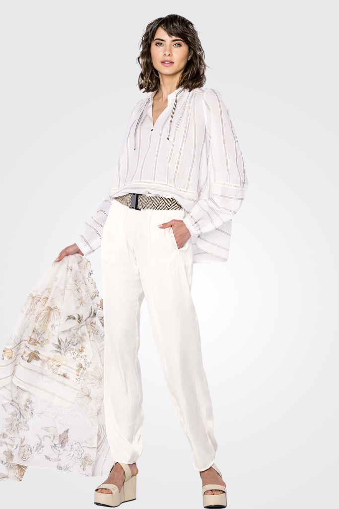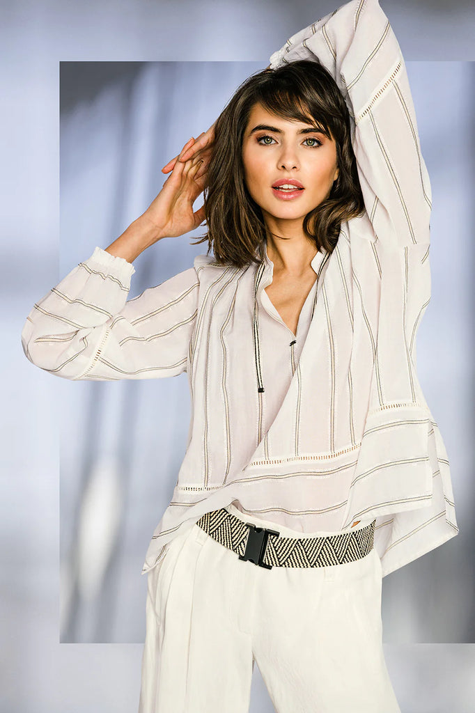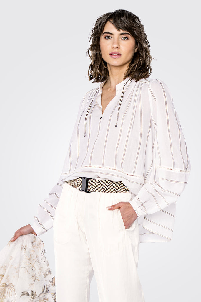 Beate Heymann sheer, cotton mix contrast stripe boho shirt. Features a mao collar with tape trim which can be tied, a subtle puff sleeve with ladder detail above elbow and pleats from shoulders and back. Hi lo hem with side slits. REF: 826-19 COMPOSITION: 86% Cotton, 9%  Viscose, 5% Acetate