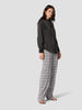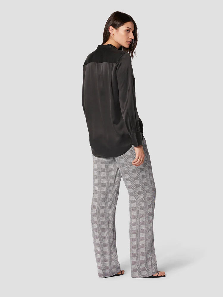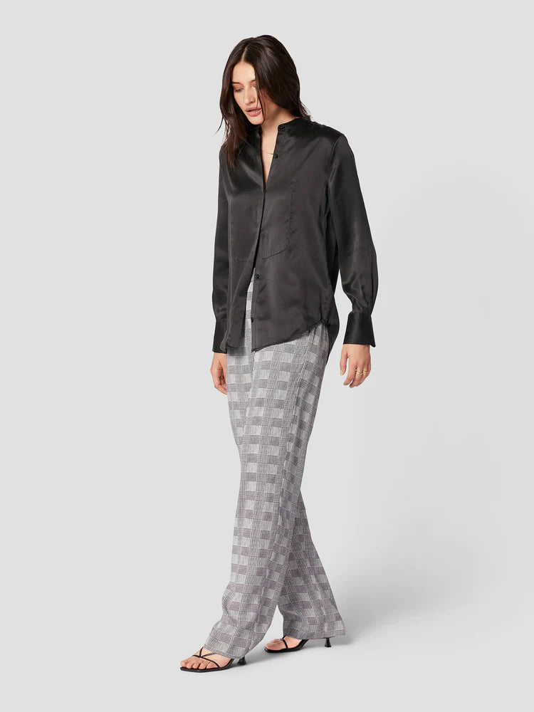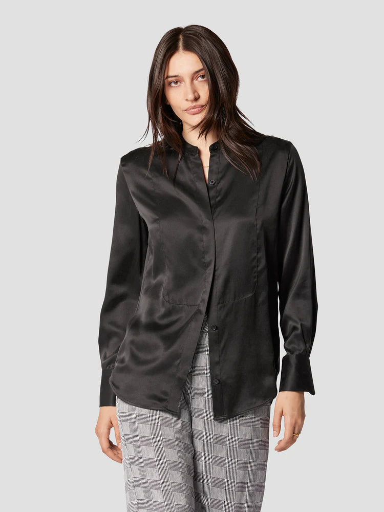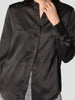 Collarless, hidden front button closure, oversized cuffs, and shirttail hemline in noble silk.