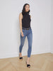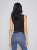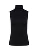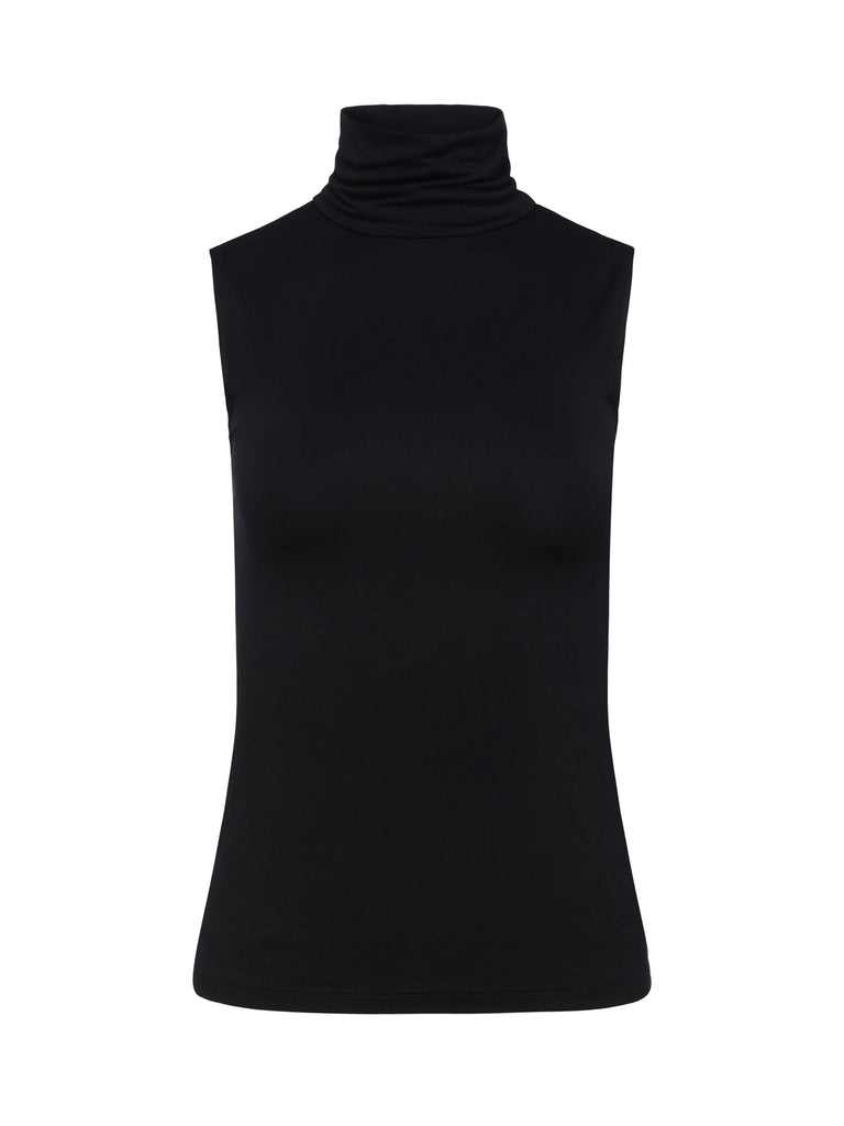 A sleeveless black turtleneck with timeless appeal gets a subtle sheen and smooth finish from a luxe microfiber fabrication. The slim fit compliments denim and is an ideal for base layer.