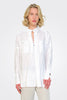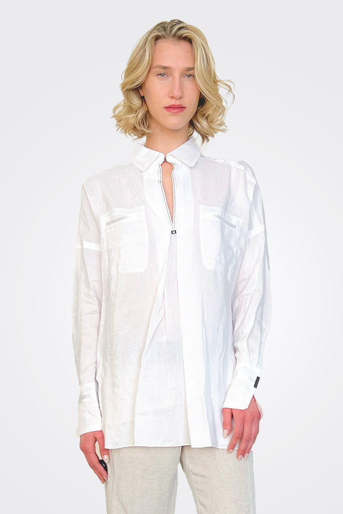 Beate Heymann linen mix shirt with a V neck hook & eye and collar. Features front and back pleat and breast pockets trimmed with tone on tone silky ribbon tape. Deep cuffs with tape trim and metal rectangular poppers. Black stitch tape detail across the back, Hi Lo hem and cut out sides. COMPOSITION: 41% Linen, 38% Viscose, 21% Rayon