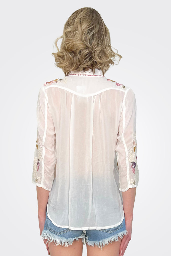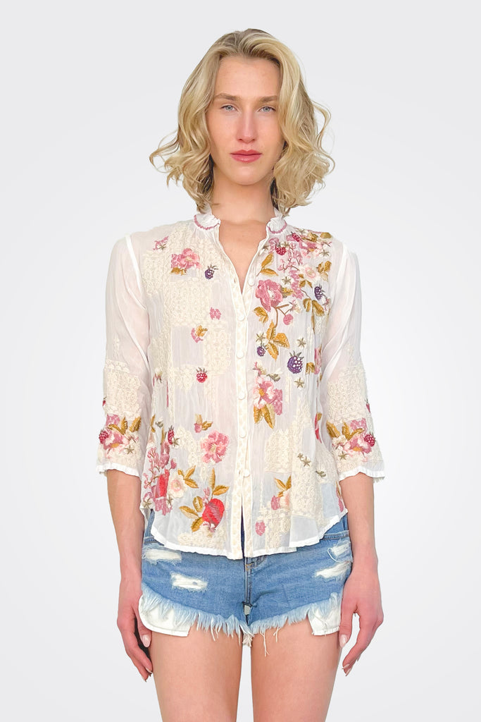 Johnny Was "Dyllan" georgette blouse with floral embroidery and ruffle trim