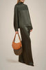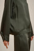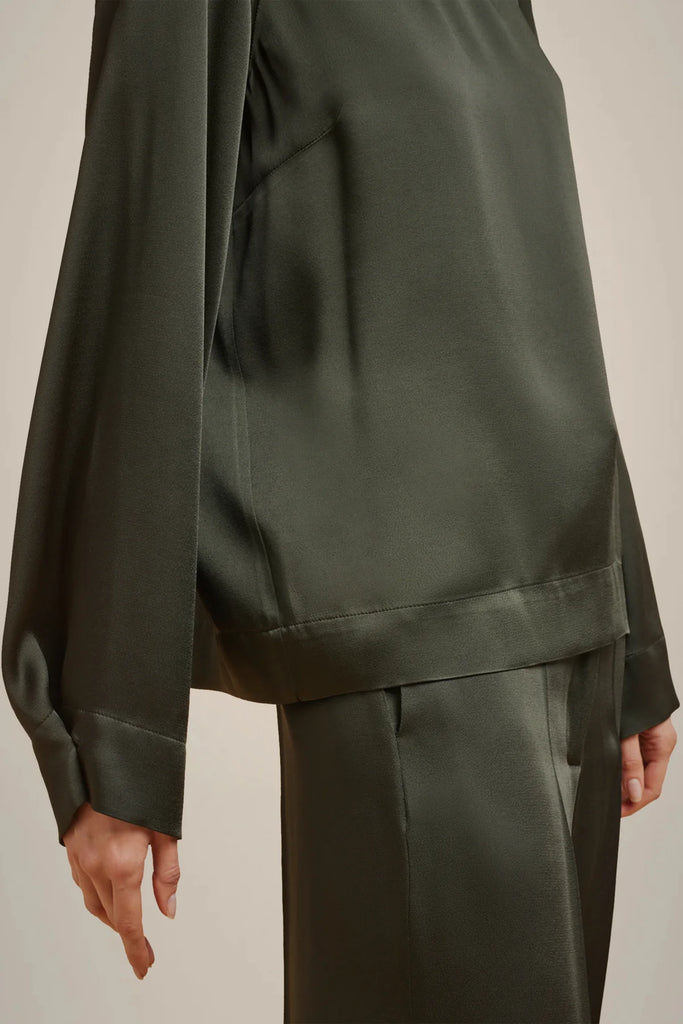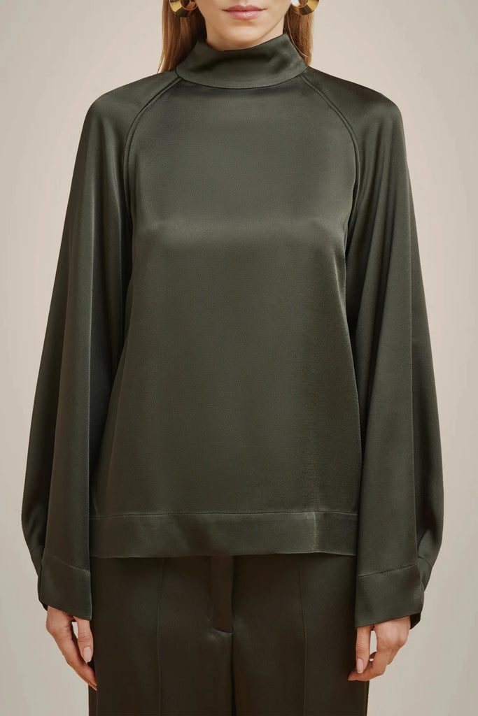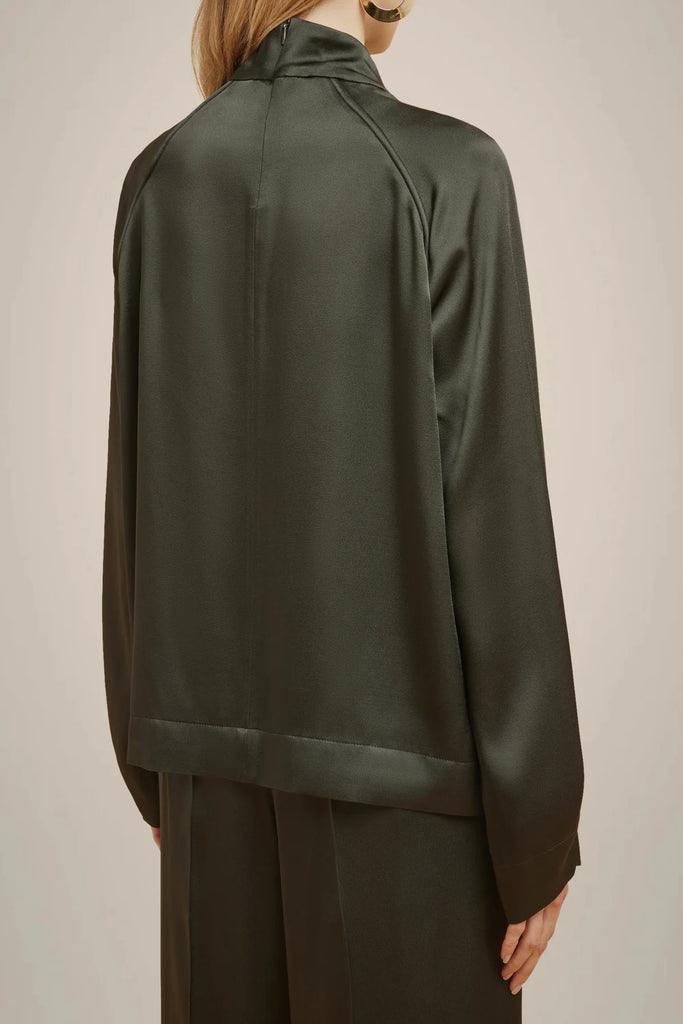 Fluid satin high neck blouse, long raglan sleeves with folded cuffs at the bottom, center back zipper.