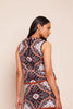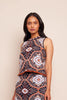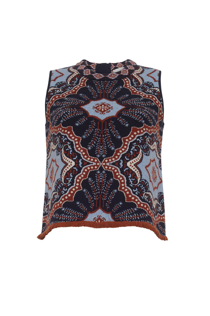 • Crewneck boxy fit• Center back gold zipper opening• Decorative fringe at hem• Printed jacquard • Sleeveless