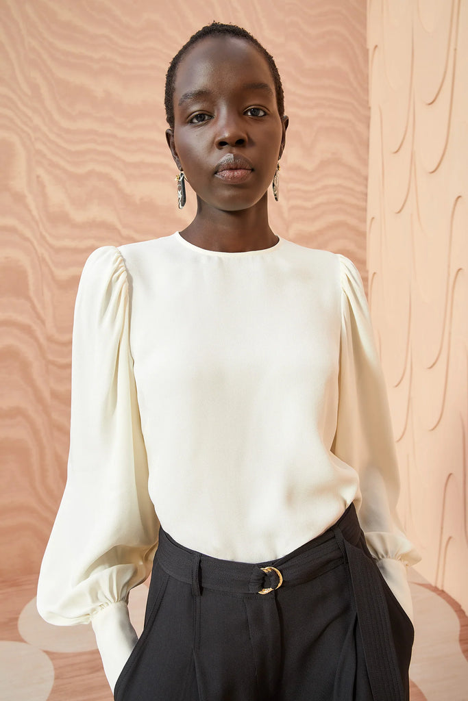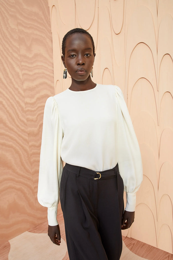 The Lilliana Blouse is made from luxurious satin back crepe which features a beautiful, flowing drape. This pearly white blouse has an airy bodice and voluminous sleeves with buttoned cuffs. It is finished with a center-back zipper.