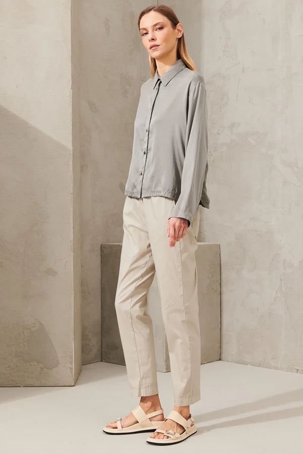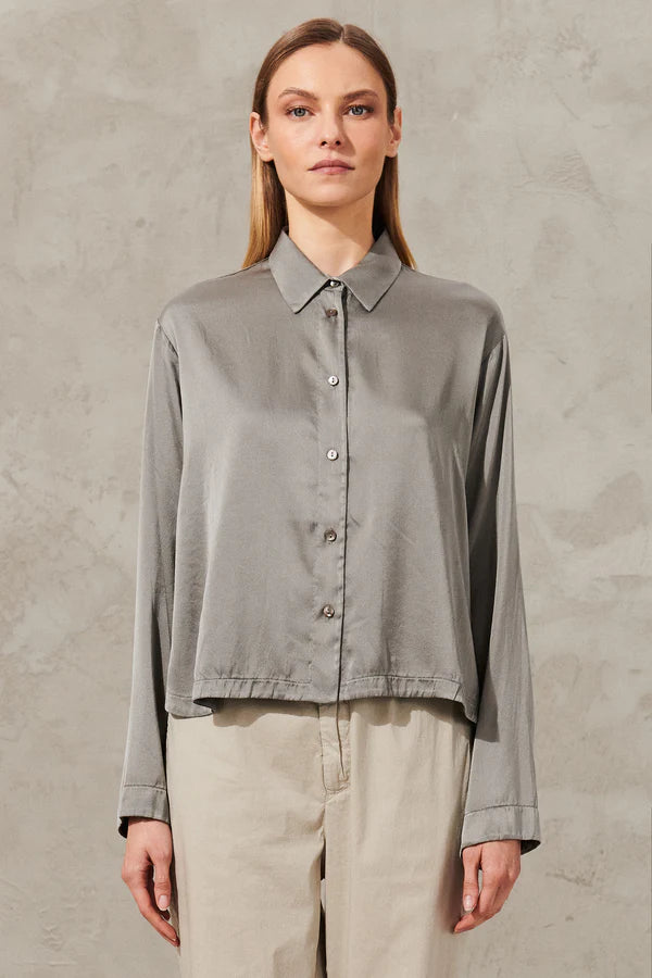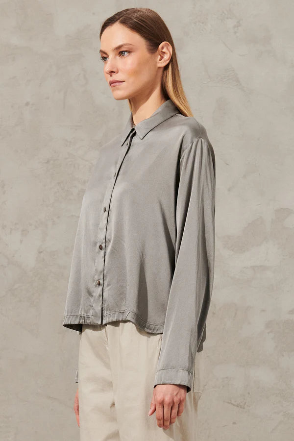Long-sleeved stretch silk satin shirt with rounded hem and vents. Garment dyed.
