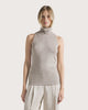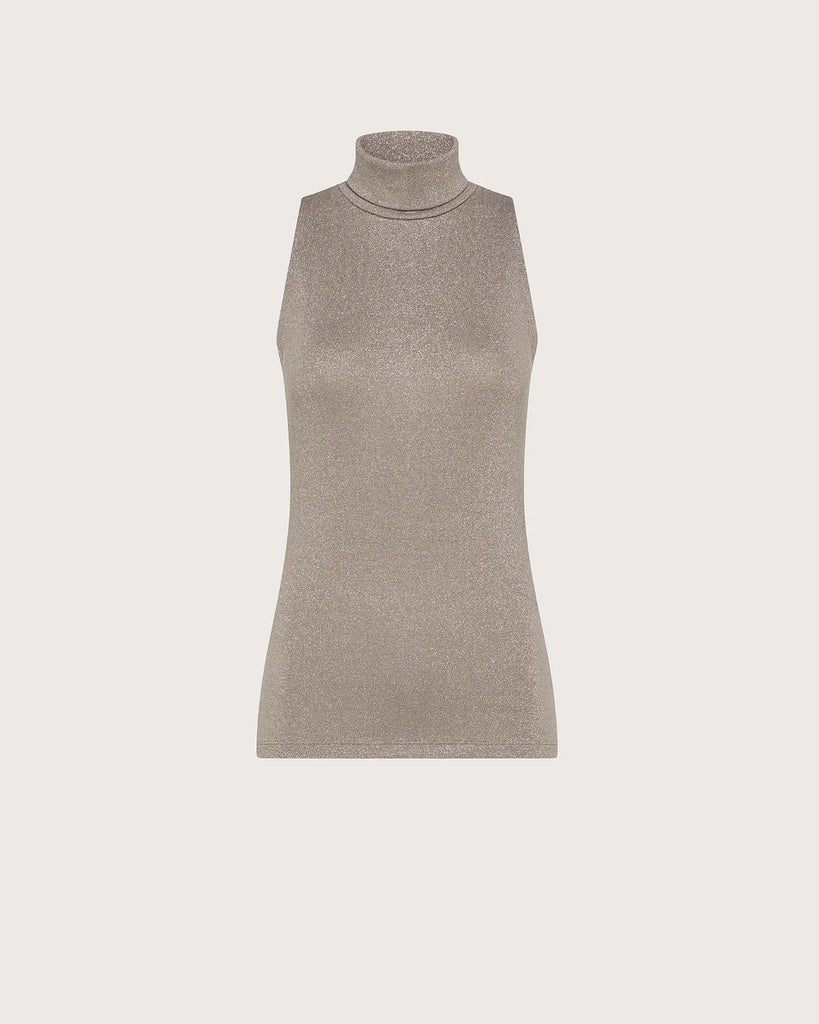 Lurex jersey sleeveless turtleneck with tight-waisted fit.