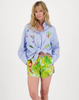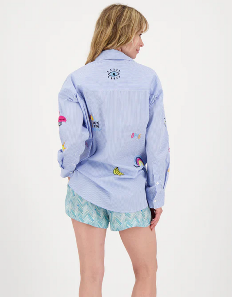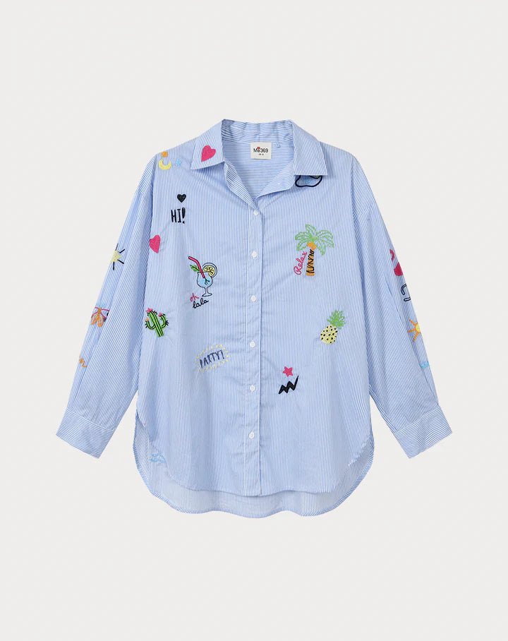 100% cotton oversized shirt. Collar, long sleeves with cuffs. Shirt is button down and long in the back with cute small embroidered graphics such as palm trees, cocktails and bananas.