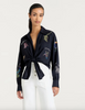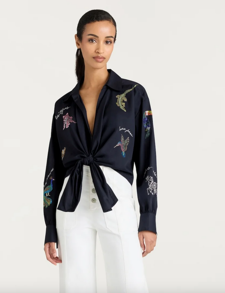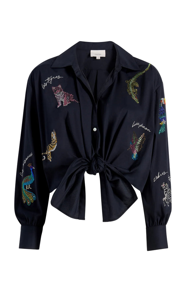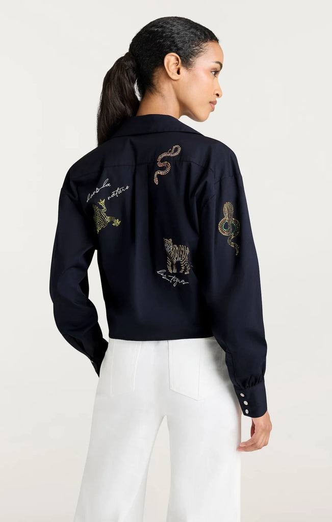 Elevate your wardrobe with the Marianna Top, now featuring wildlife-inspired heatset embellishments. This top boasts a cropped, button-front design with a collared neckline and tie detail, adding a unique, elegant touch to any outfit. With the added embellishments, this must-have piece blends sophistication with a touch of nature-inspired flair.