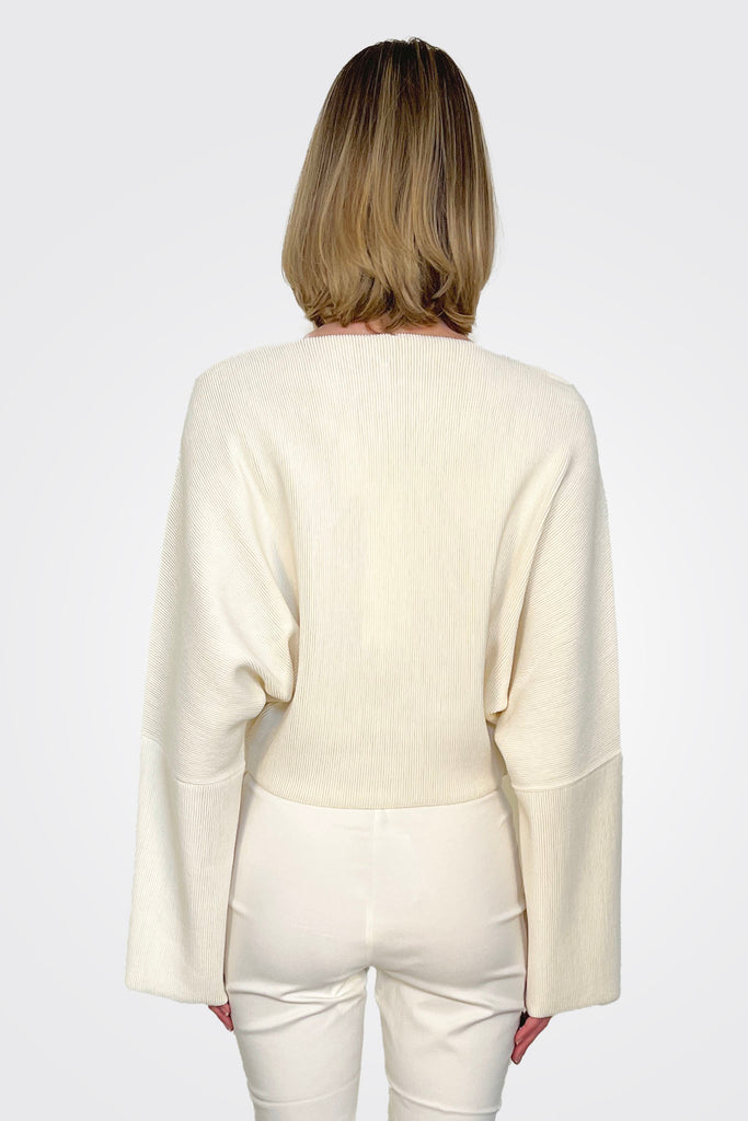 100% extra-fine merino wool crew neck sweater, ottoman pattern, three-quarter sleeves, flared at the bottom.