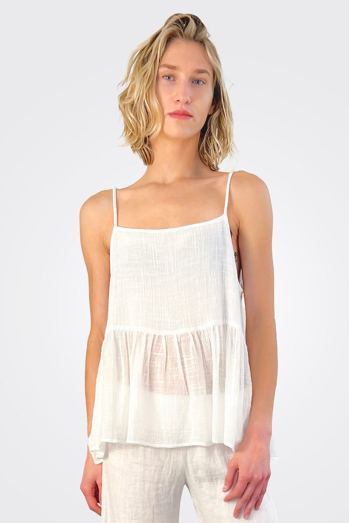 Cotton blend. Imported. Hand wash recommended. Adjustable shoulder straps. Gauze fabric with flowy silhouette.