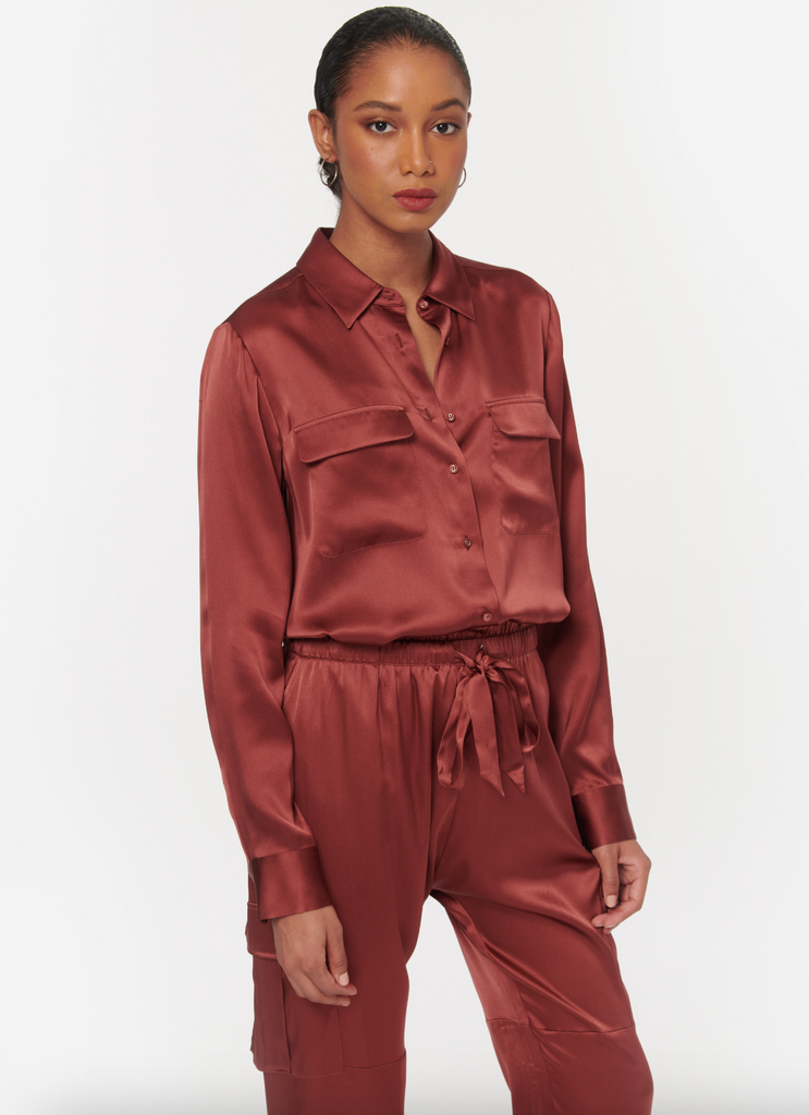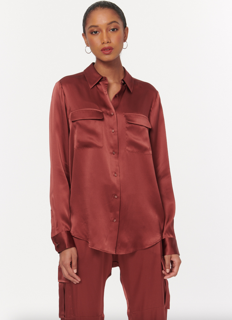 brand favorite Rachelle shirt is crafted in a silk sandwash charmeuse as a button down blouse This light-weight blouse style has is perfect in any season. The perfect day to night wardrobe builder.