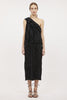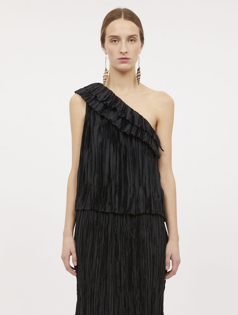 The Ravenna Top is a white sleeveless style, crafted from our signature crushed plissé satin. This one-shouldered silhouette is defined by a delicate double-ruffle detail along the shoulder and is finished with a side-seam zipper.