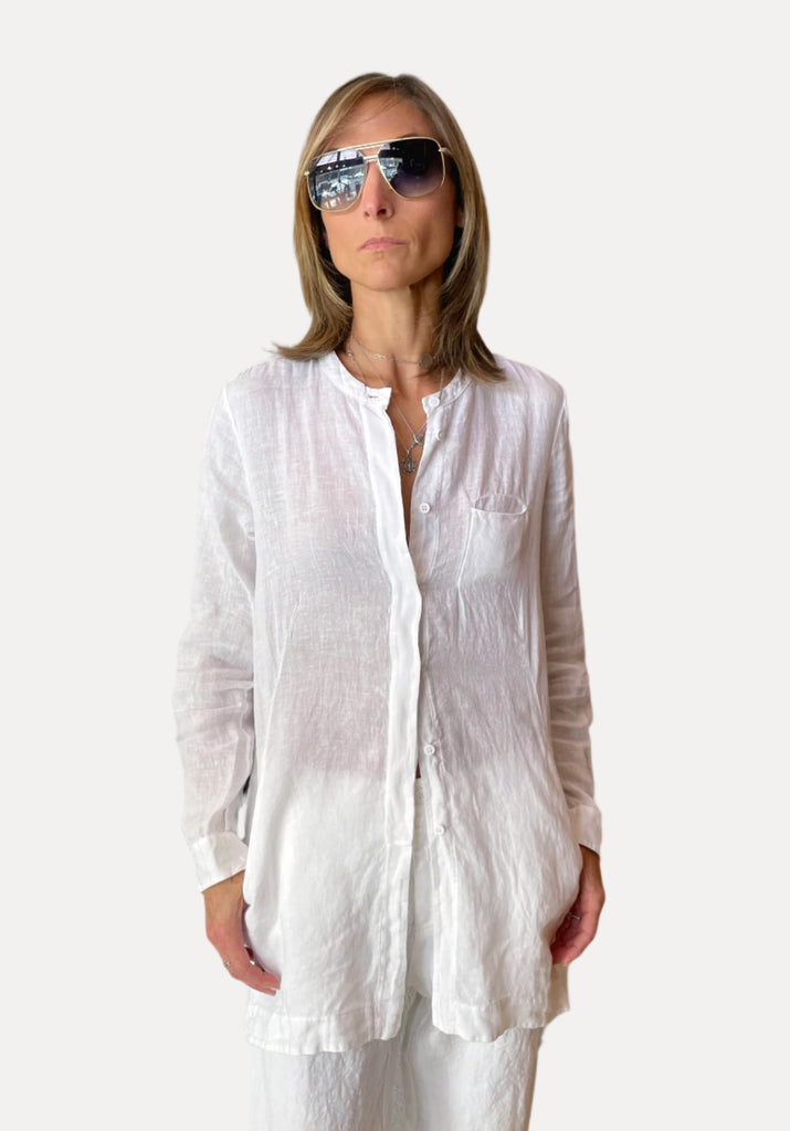 Long-sleeved, light garment-dyed linen shirt. Band collar. Hidden buttons in georgette. Front pocket. Welt side pockets. Three buttons on the cuffs. Yoke on the back with a cut and a pleat.