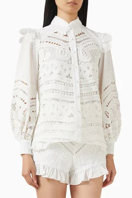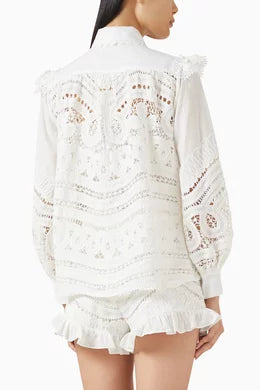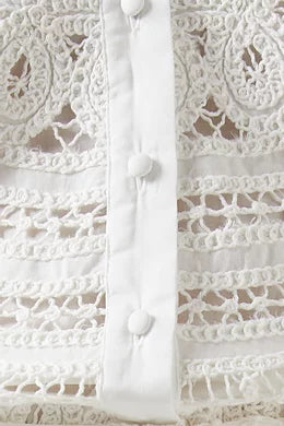 Escape to sun-kissed days with this enchanting lace shirt, designed for effortless elegance. Its delicate fabrication and flowing silhouette create a graceful, bohemian allure, perfect for luxurious layering. Intricate embroidered patterns and subtle ruffle details add an exquisite, artistic finish.