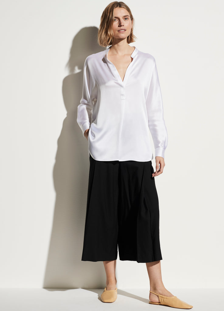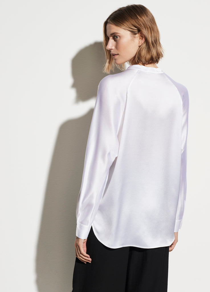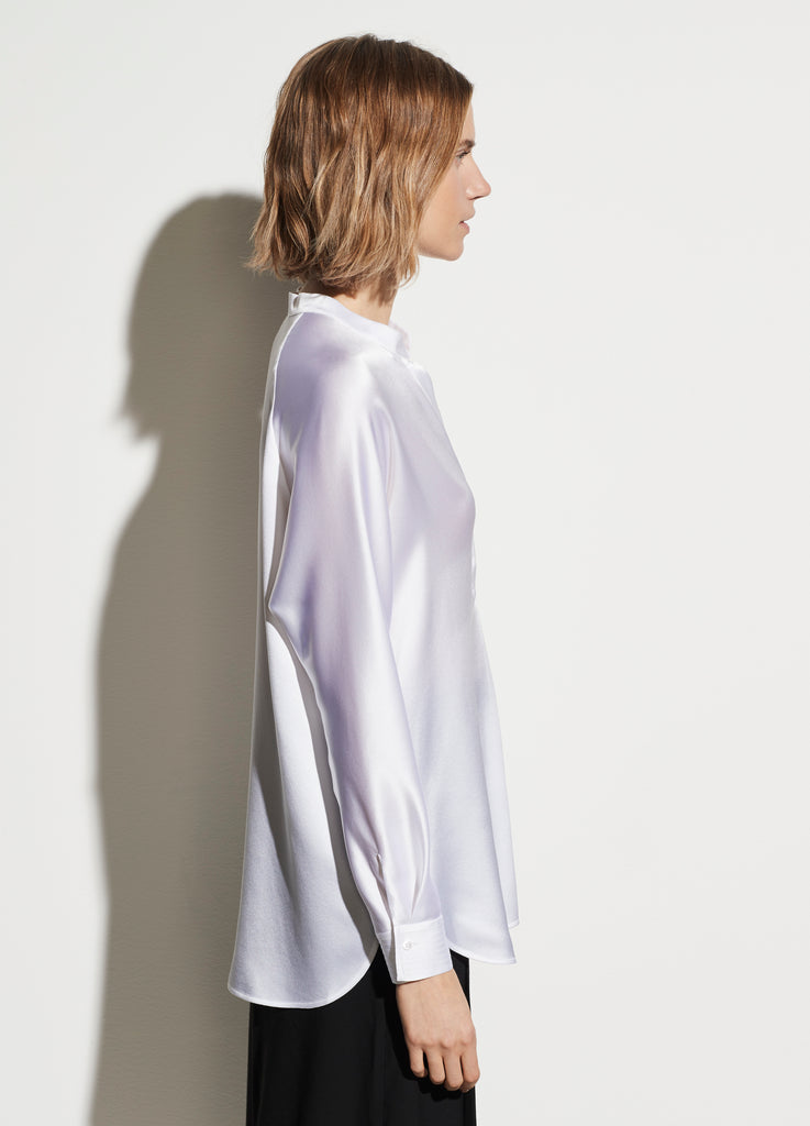 An effortless popover blouse in smooth satin with a band collar, split neckline, and long sleeves.