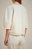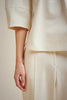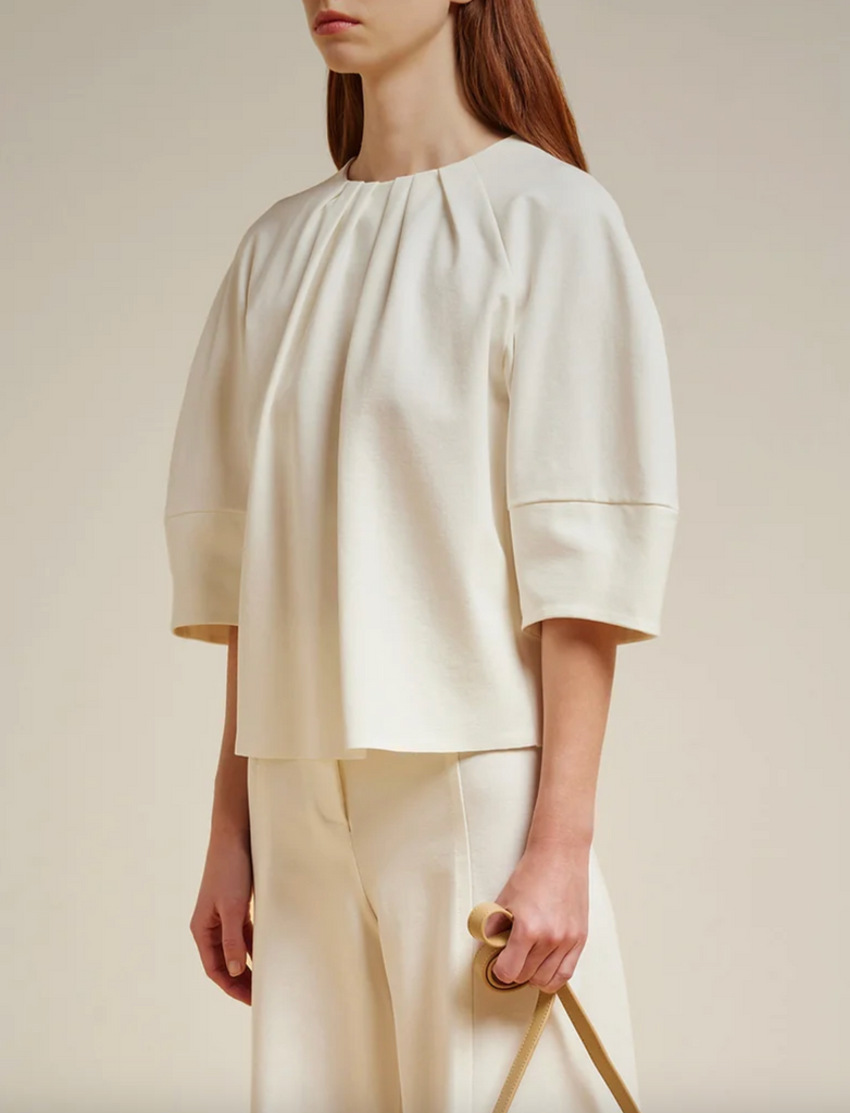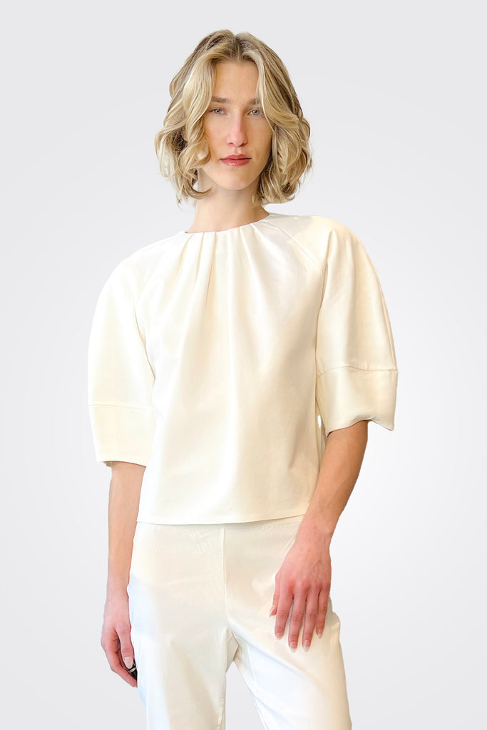 Milan stitch blouse, crew neck with gathered detail, raglan cut and short shaped sleeves with edge at the bottom.