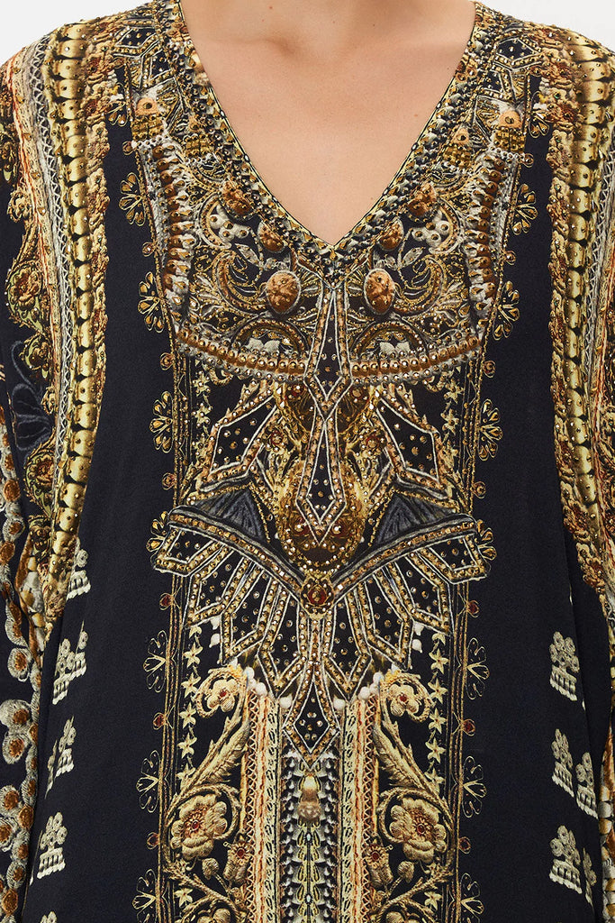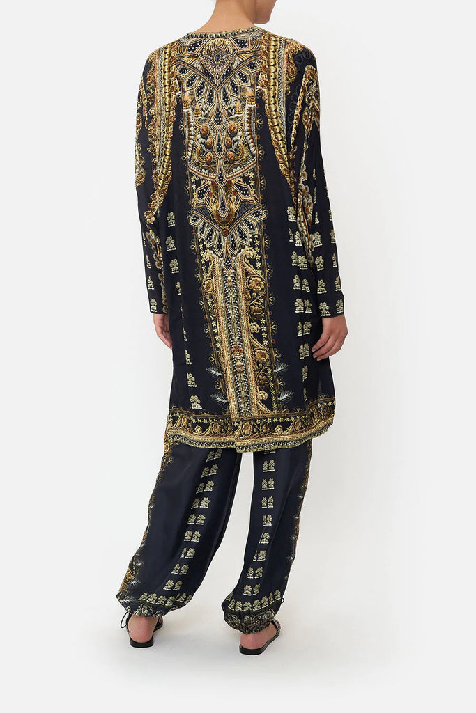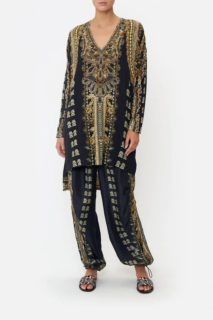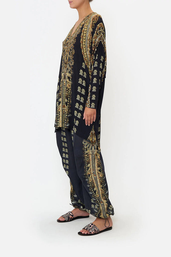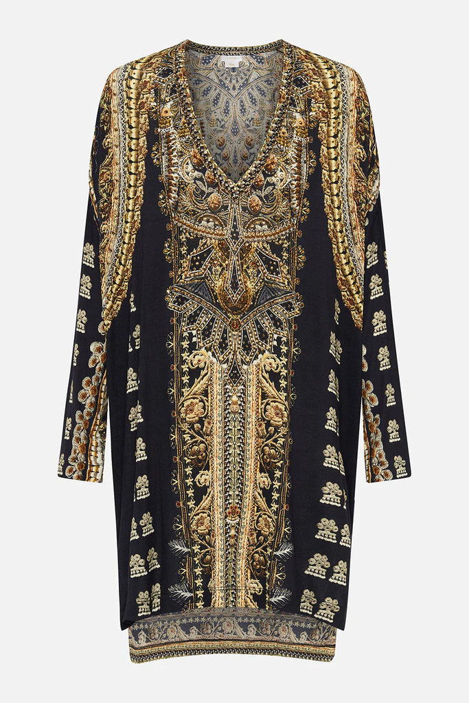 Decadently ornate for cooler moments, the It’s All Over Torero Side Split Tee captures our gaze a deep shade of midnight as rich weavings work their way around baroque detailing and subtle botanicals. Adorning hand-embellished crystals, this luxury knit features a relaxed longline silhouette, a deep v neckline, statement batwing sleeves and a high-low hemline. Take it out on the town with a boot and bare pins.