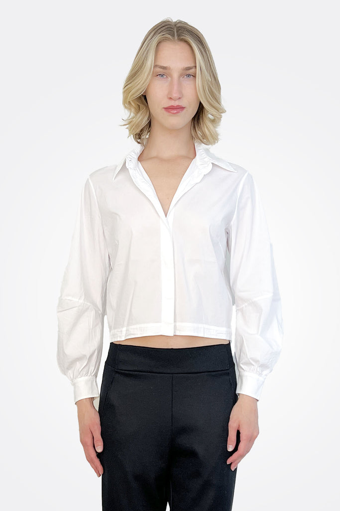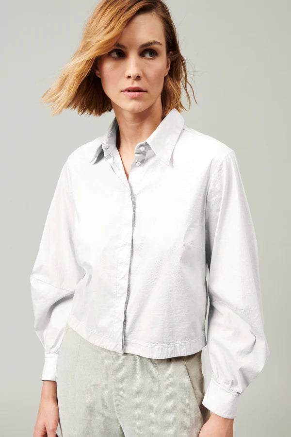 Stretch cotton poplin shirt. Regular collar, hidden placket with mother-of-pearl buttons. Shaped voluminous sleeve, relaxed fit.