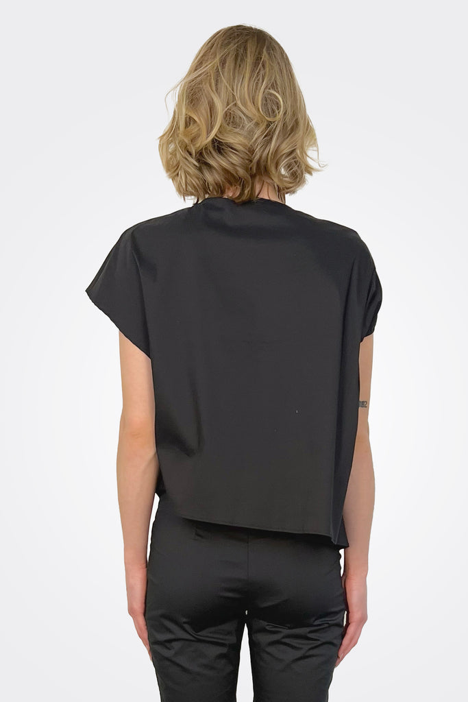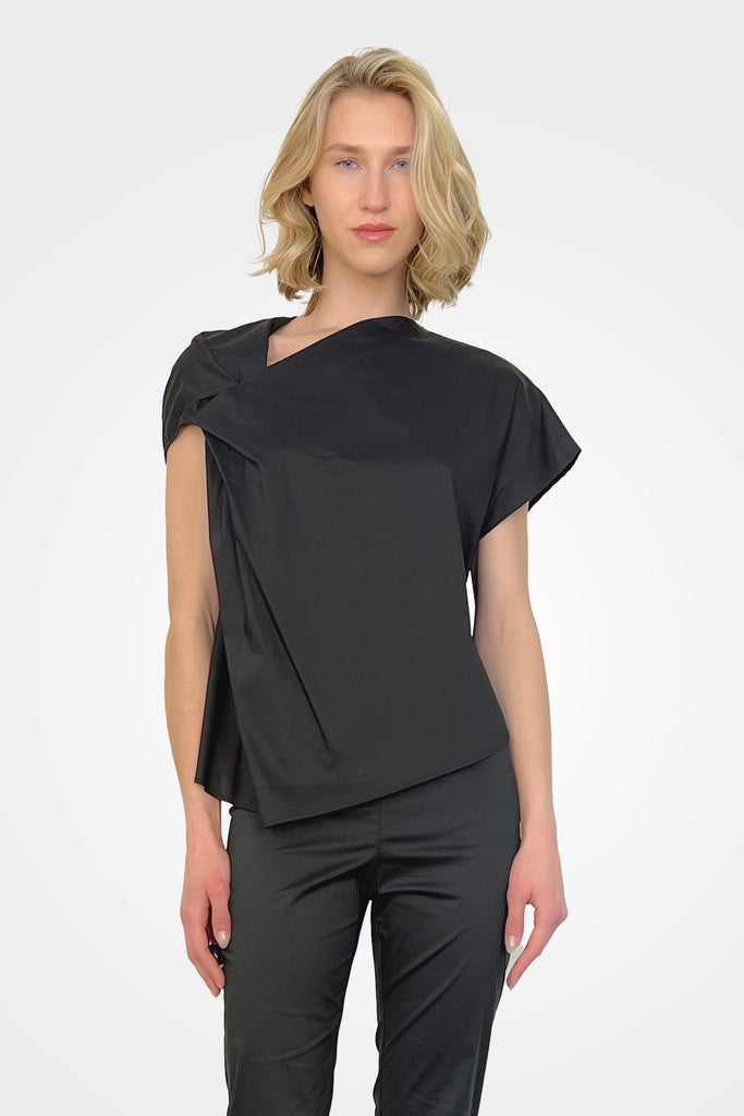 Stretch poplin blouse, V-neck, asymmetrical armholes, pleated detail on the side.