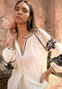 It has a regular fit with delicate lace inserts and placement embroideries in contrast colors, drawing its inspiration from the Mughal embroidery era. The contrast-colored block stripes call for a modern, contemporary expression.