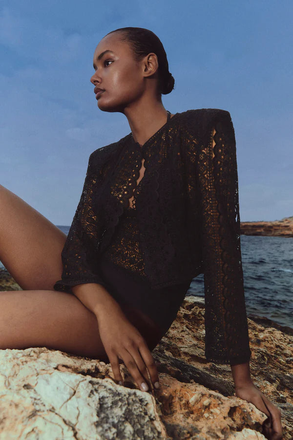 TILMA is the perfect jacket for all your seasonal events. With its intricate floral pattern and delicate texture, the guipure adds a romantic and feminine touch to this piece. Its flattering cut impeccably fits the silhouette, and its box collar adds elegance. Combine it with your favorite dresses from the collection to create a glamorous look.