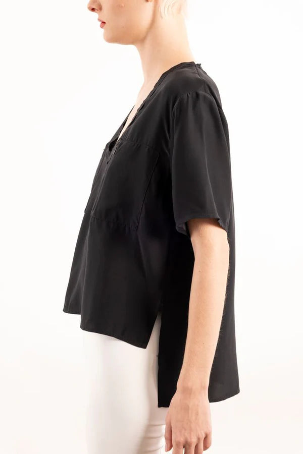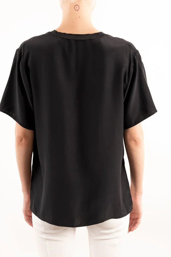 A chic V neck tee with a twist! Cut from luxe washable silk, it features front zip pockets that are functional and add visual interest. Perfect for layering or wearing on it's own - a wardrobe staple that transitions effortlessly between seasons! Wear with our Yasmine skirt done in the same silk for an effortlessly chic look.