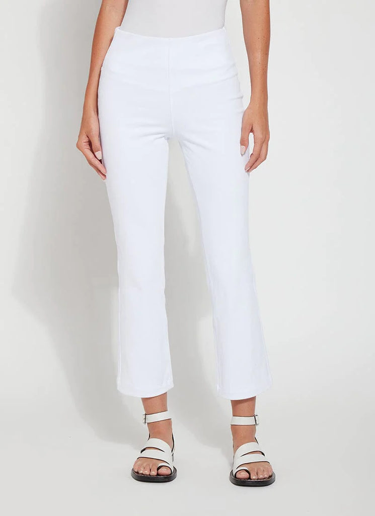 Crafted from stretchy Knit Denim, the work or leisure Ankle Baby Bootcut offers pull-on styling, a concealed patented waistband and contrast-color top stitching. These bootcut jeans are rich in detail with studded back pockets and anatomical seaming that lifts and contours. The Baby Bootcut jean skims the hips and thighs before falling into an open bootcut hem. Pull them on for work or play with an ivory mock-neck top, black booties and faux leather fringed jacket.