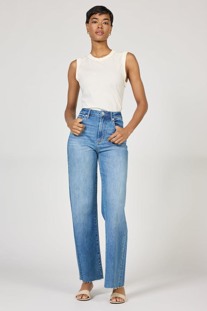 Fiona high rise jean featuring a trendy cut-off hem enhances your style while offering relaxed fit with unparalleled comfort.