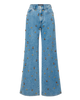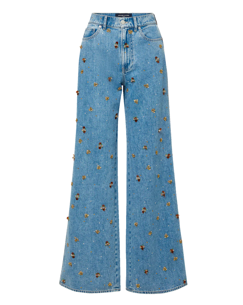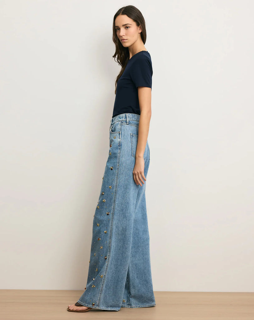 essential wide-leg jean, reimagined with embellishments. The Kasey is expertly crafted from our signature Dream Denim—our impossibly soft, most comfortable denim yet. A mid-rise waist and full-length leg create a flattering, elongating silhouette, while beaded floral accents and sequins down the front panels add a feminine touch. Style this high-shine blue jean with a sleek top and heels for your next night out.