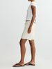 Ecru Aura is a neutral colored denim. It features silver hardware, tonal stitching, a clean hem and an ecru back patch.