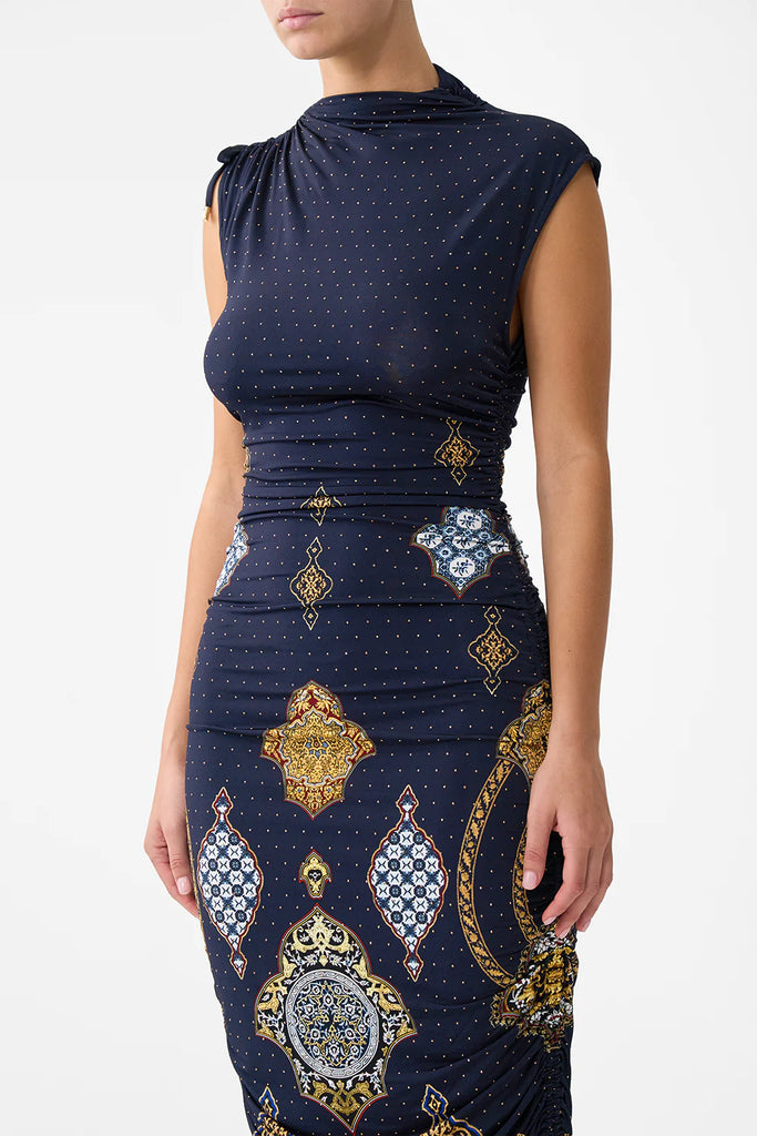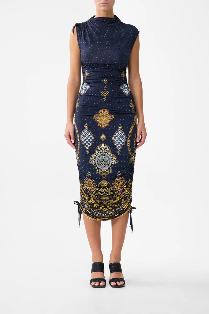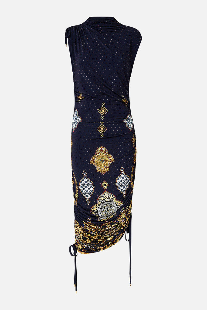 The The Imperial Gate Asymmetric Ruched Jersey Dress is a handcrafted silhouette designed by our in house artisans. Reimagined in an exclusive limited edition print, our ruched jersey dress sculpts the form with a sleeveless, figure hugging shape and all over ruching. Adjustable side ties invite you to play with asymmetry and discover your desired hemline.