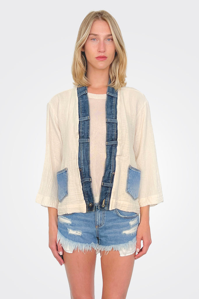 Our Cotton Gauze fabric is made of soft 100% natural cotton fibers that make it breathable, hypoallergenic and light-weight. It is woven using a special technique that involves twisting horizontal warp threads around the vertical weft threads, resulting in a soft, crinkled, and loosely-woven texture with a slight vertical stretch. We focus on having minimal environmental impact by carefully selecting materials like this Cotton Gauze, as it is a wonderful long lasting material and local to our artisan maker’s region.