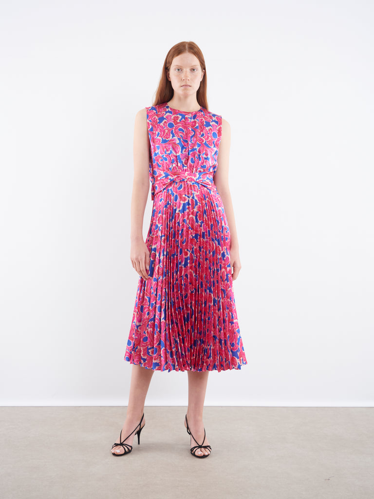 The Gwen-B Dress features a sleeveless design with a stunning twisted and gathered detail at the waist, creating a flattering and feminine shape. The pleated skirt flows gracefully, adding elegance to every step, making it the perfect classic summer dress to wear time and time again
