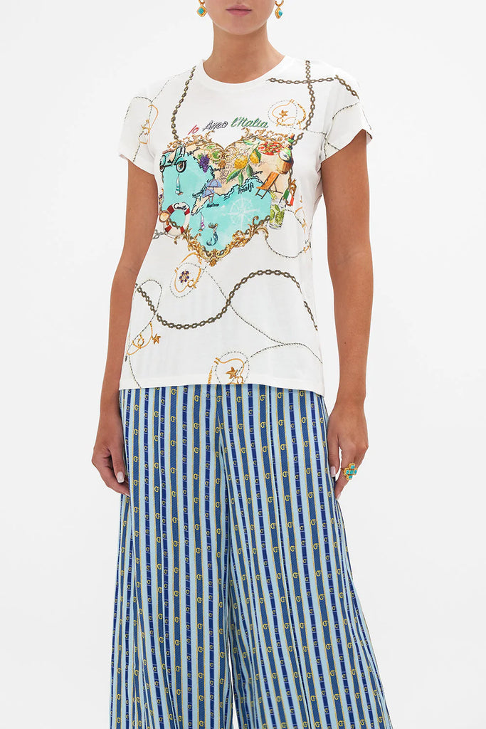 The Amalfi Lullaby Organic Cotton Slim Fit Tee depicts the beautifully bright exuberance of the Italian coastline, capturing the essence of seaside summer bliss. Crafted from breathable cotton, this statement tee is home to an elegant round neckline, embellished with CAMILLA crystals, cropped sleeves, a relaxed slim-fit silhouette finished with ribbed accents at the neckline. Wear tucked into the Amalfi Lullaby Scarf Belt Wide Leg Pant for a chic longline silhouette. Lovingly handcrafted, designed in Australia. Explore more from the Amore Mio collection.