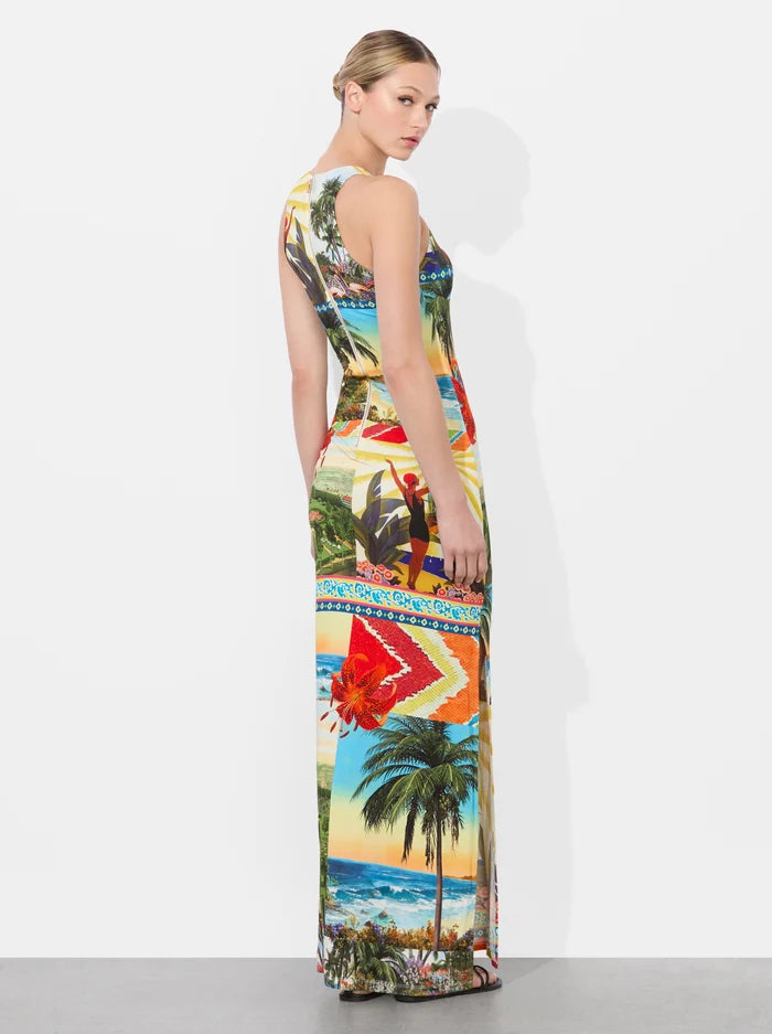 Made for sun-drenched getaways and balmy nights, this high neck maxi dress is a body-hugging beauty in our bold Island Dreams print. The stretch fabric molds to your shape with a high slit for added drama and movement. The back zip keeps the silhouette clean, while the print brings the party. Just add gold hoops and your destination of choice.