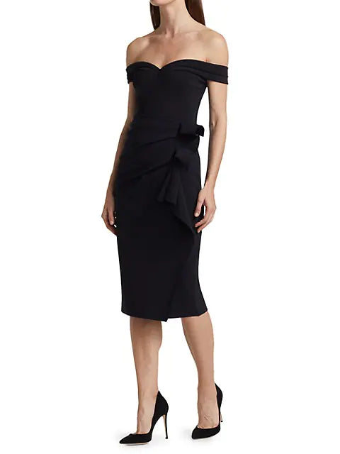 Silhouette-skimming midi dress with a sultry sweetheart neckline and ruffle trim front skirt.