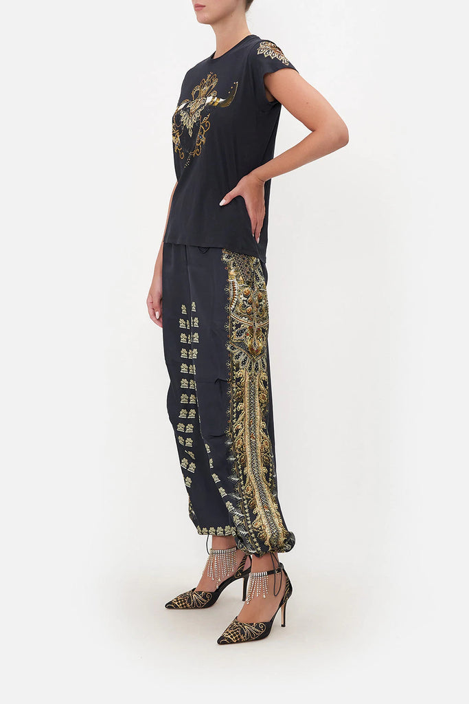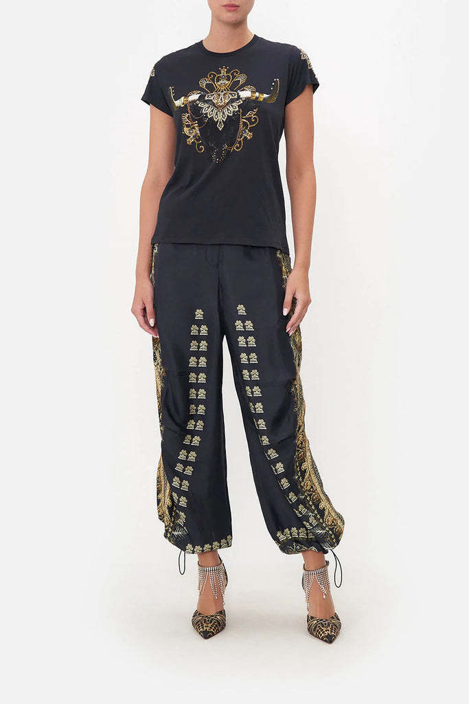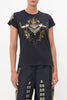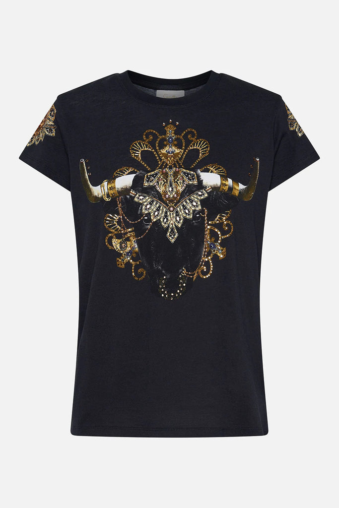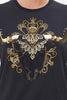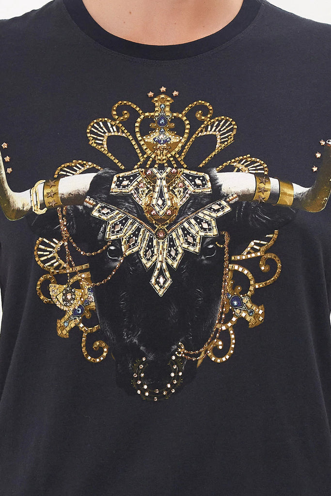 Everyday intrigue meeting touches of Mother Earth, the It’s All Over Torero Slim Fit Round Neck T-Shirt captures the gaze with wild majesty adorned in lavish gold cascades, gemstone tones and ornate crown jewels. Crafted from cotton dipped in shades of midnight, this statement tee features a classic round neckline, cropped sleeves, a relaxed slim-fit silhouette and breathability.