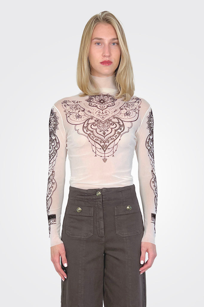Stretch tulle single layer top that features an embossed suede henna tattoo print on front and back