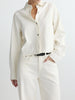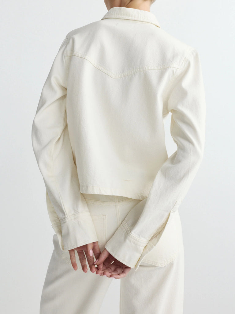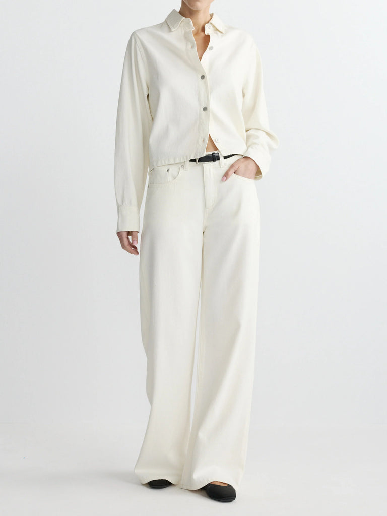 Eggshell is a soft white denim. It features silver hardware, tonal stitching and a clean hem.