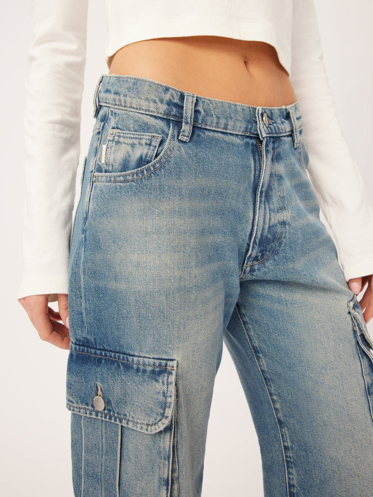 Aged Mid Cargo is a vintage inspired mid-indigo wash with an authentic worn-in look and cargo pockets at the thigh. It features brushed silver hardware, multi-colored stitching, wide clean hem and an ecru back patch.
