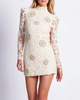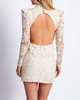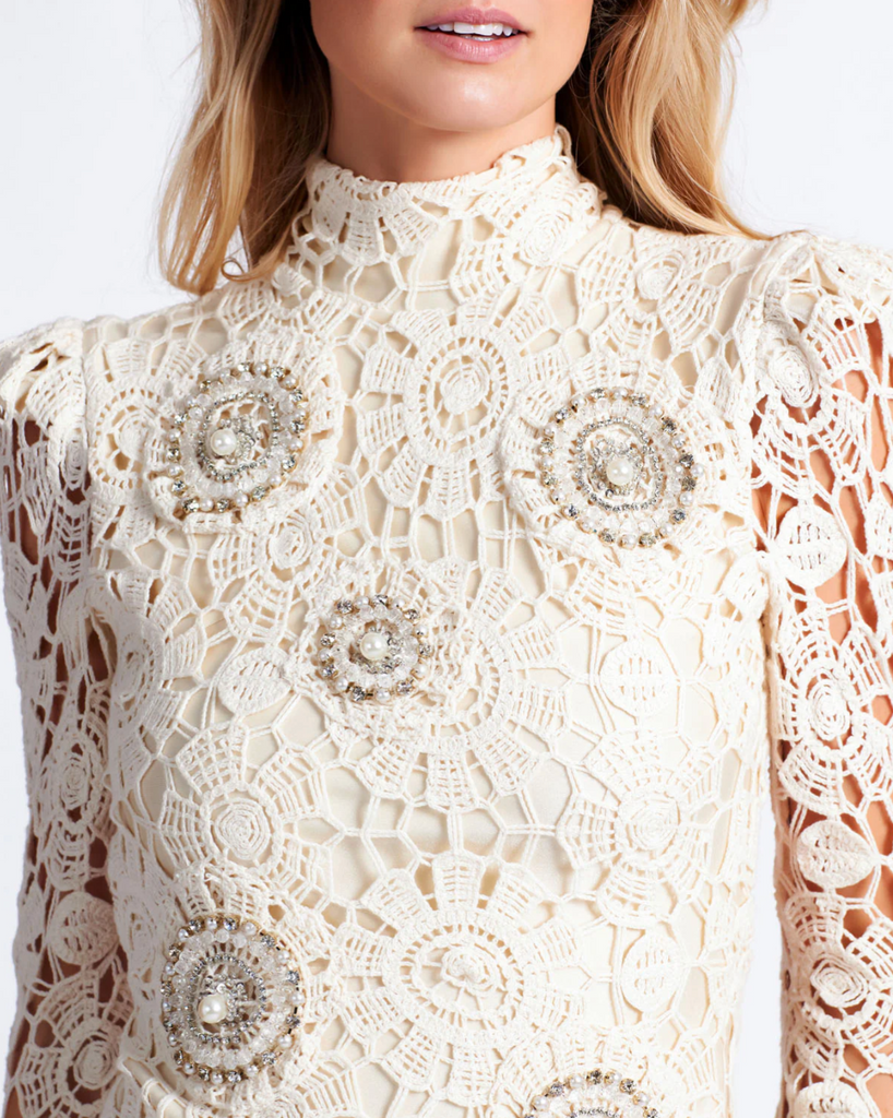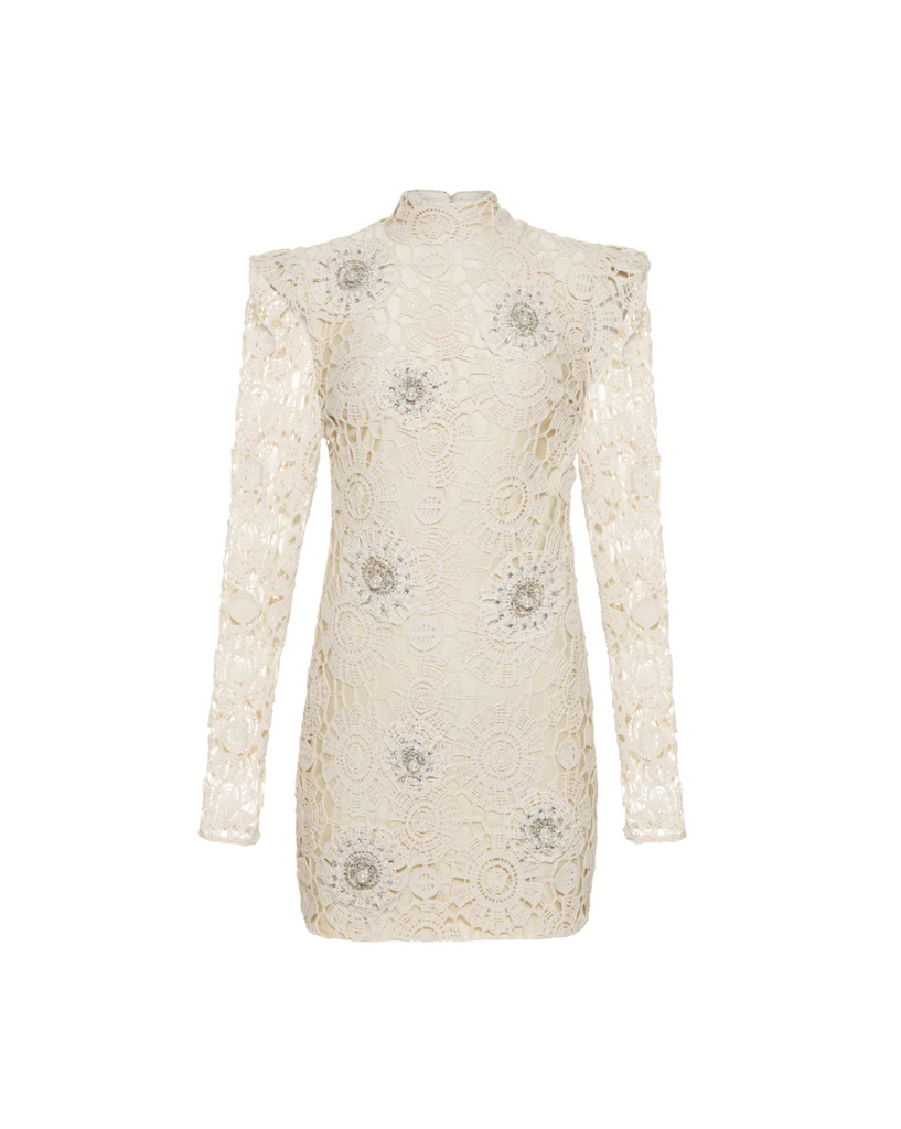 This crochet mini dress features beaded detail and lycra fabric lining for a form-fitting flattering look. Exposed open back with a high neck closure and dinset pointed shoulder details. Runs true to size.