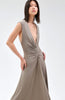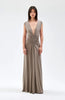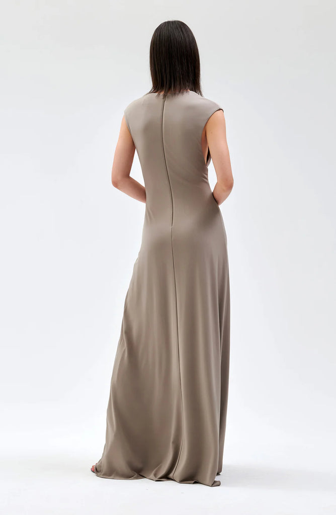 A cool grey hue and sculpted silhouette define this dress. A fitted bodice enhances the shape, while a flowing skirt adds movement. Understated and elegant, it embodies modern sophistication.