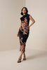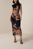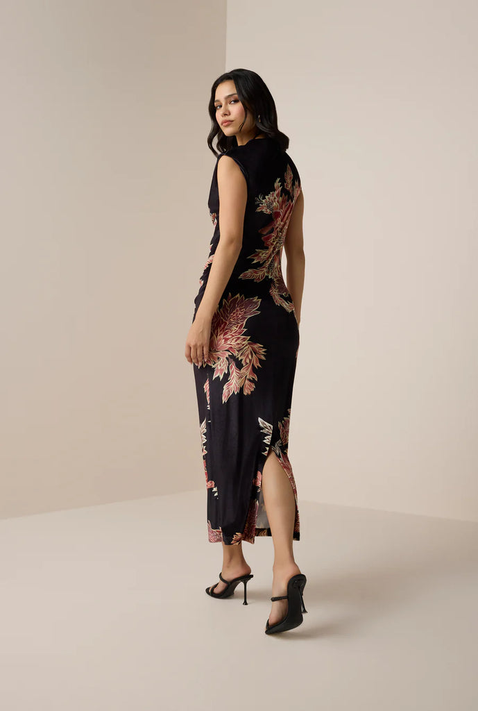 The Johi Cowl Neck Midi Dress is an ode to understated evening glamour. Crafted from sumptous polyester velvet knit lycra, it features a sleek black contemporary baroque print. The elegant cowl drape neckline flows into extended shoulder sleeves, lending a refined yet modern edge. Designed for a fitted look, this midi dress skims the body, while the back zipper closure ensures a clean seamless finish.