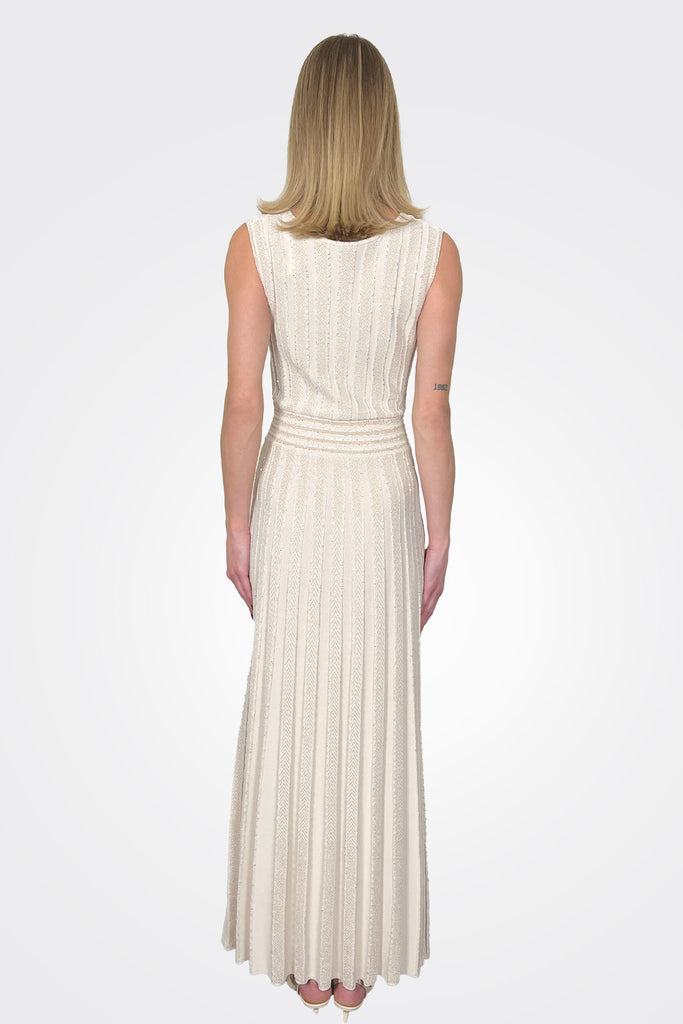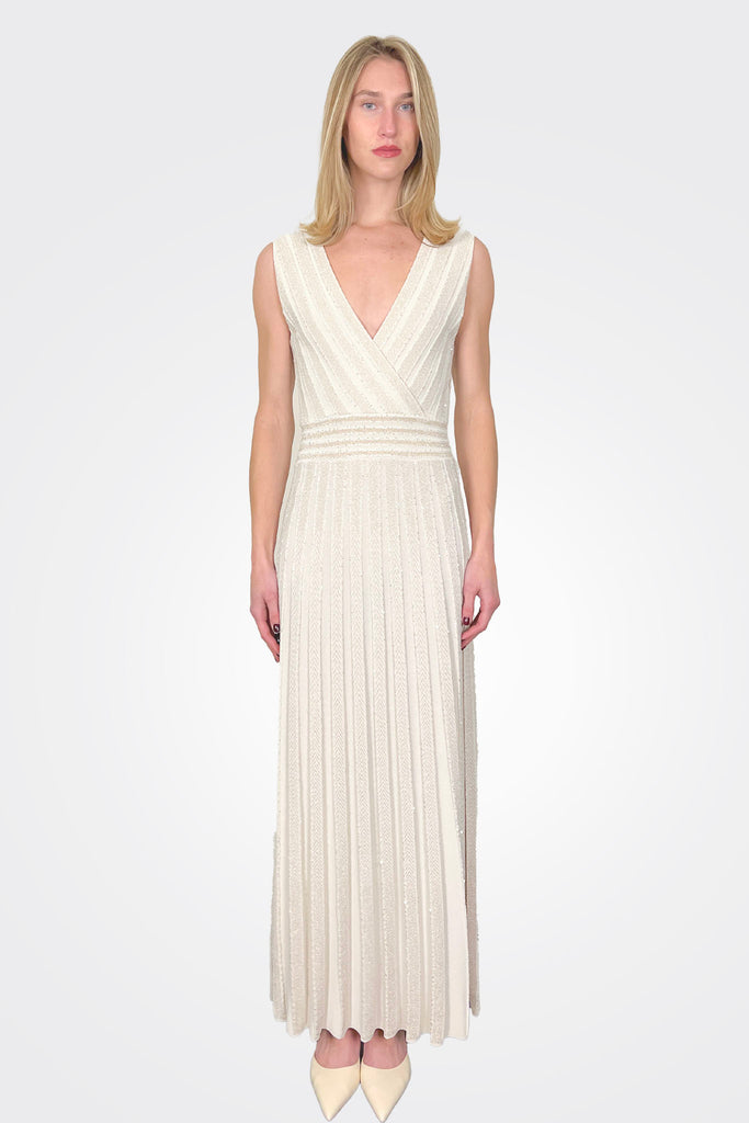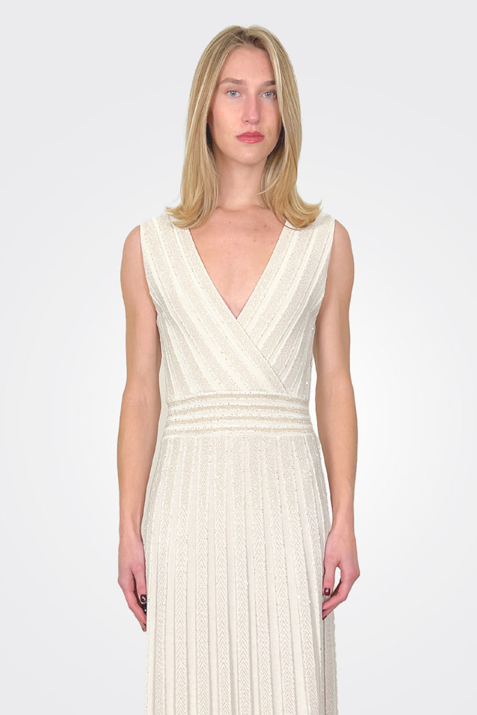 Long D.Exterior knit dress. Lurex and sequin details, criss-cross V-neck, sleeveless, side zip, regular fit. Composition: 72% viscose, 8% polyester, 20% polyamide. Made in Italy.