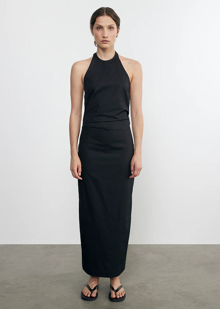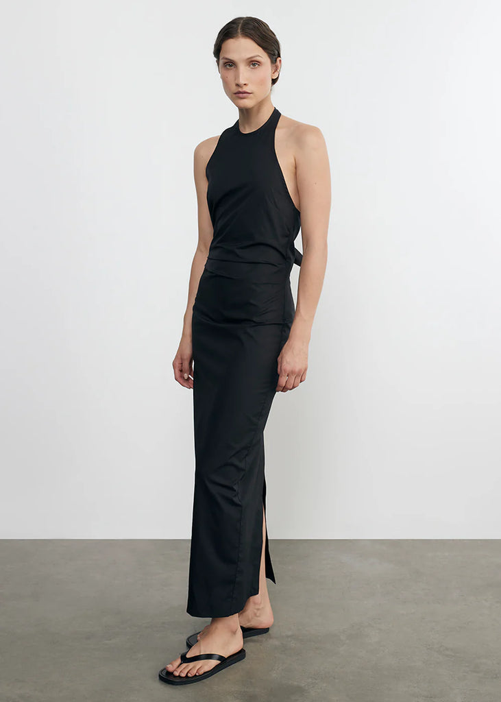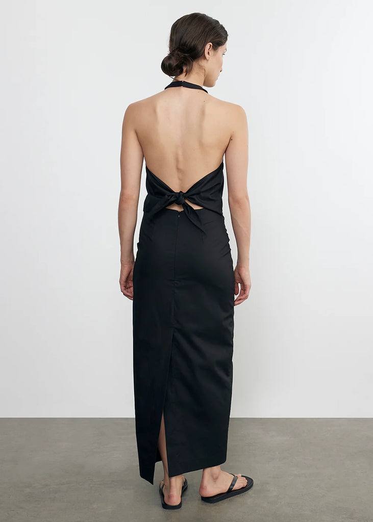 Lightweight and breathable, this dress is made from 100% cotton poplin, giving it a structured and smooth. Featuring a halter neckline with a tie-back detail for an adjustable fit and an ankle-skimming length, this dress is effortlessly elegant.